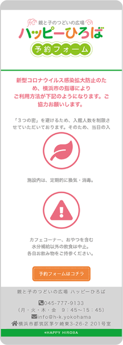 2020年8月24日 / 最終更新日時 : 2020年8月24日 tete WEB 予約方法のページ 親と子のつどいの広場の予約方法のページを作成しました。小さいお子さんがいるママ向けの予約サイトなので、スマートフォンからもパソコンからも見られるようにしました。予約フォームはレンタルのものを利用しています。 2020年6月 Follow me! FacebooktwitterHatenaPocketCopy コメントを残す コメントをキャンセルメールアドレスが公開されることはありません。 ※ が付いている欄は必須項目ですコメント ※ 名前 ※ メール ※ サイト 次回のコメントで使用するためブラウザーに自分の名前、メールアドレス、サイトを保存する。